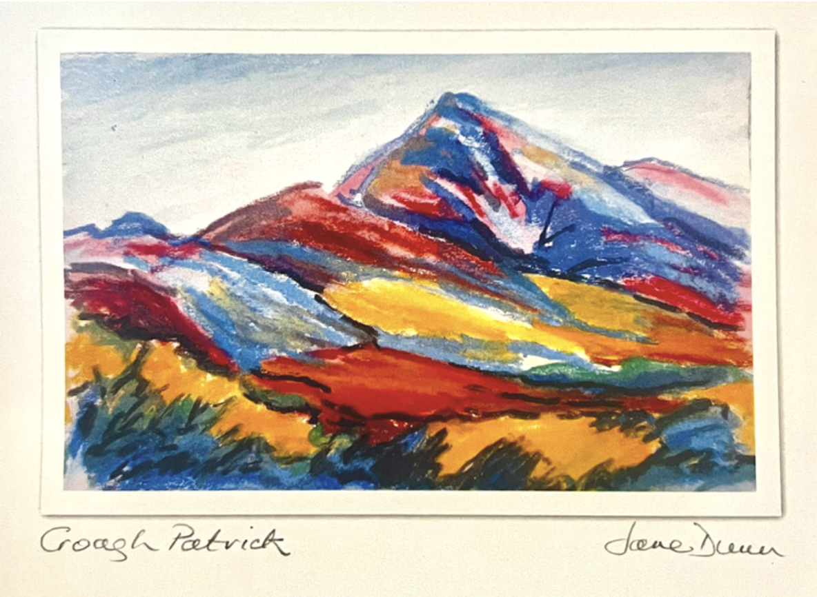 I picked up this postcard as my souvenir from the trip to the top of Croagh Patrick. The style reminded me of a postcard I found shortly after my hike up Mount Katahdin. Check out more original art inspired by the Irish landscape around County Mayo by artist Jane Dunn at janedunn.com.